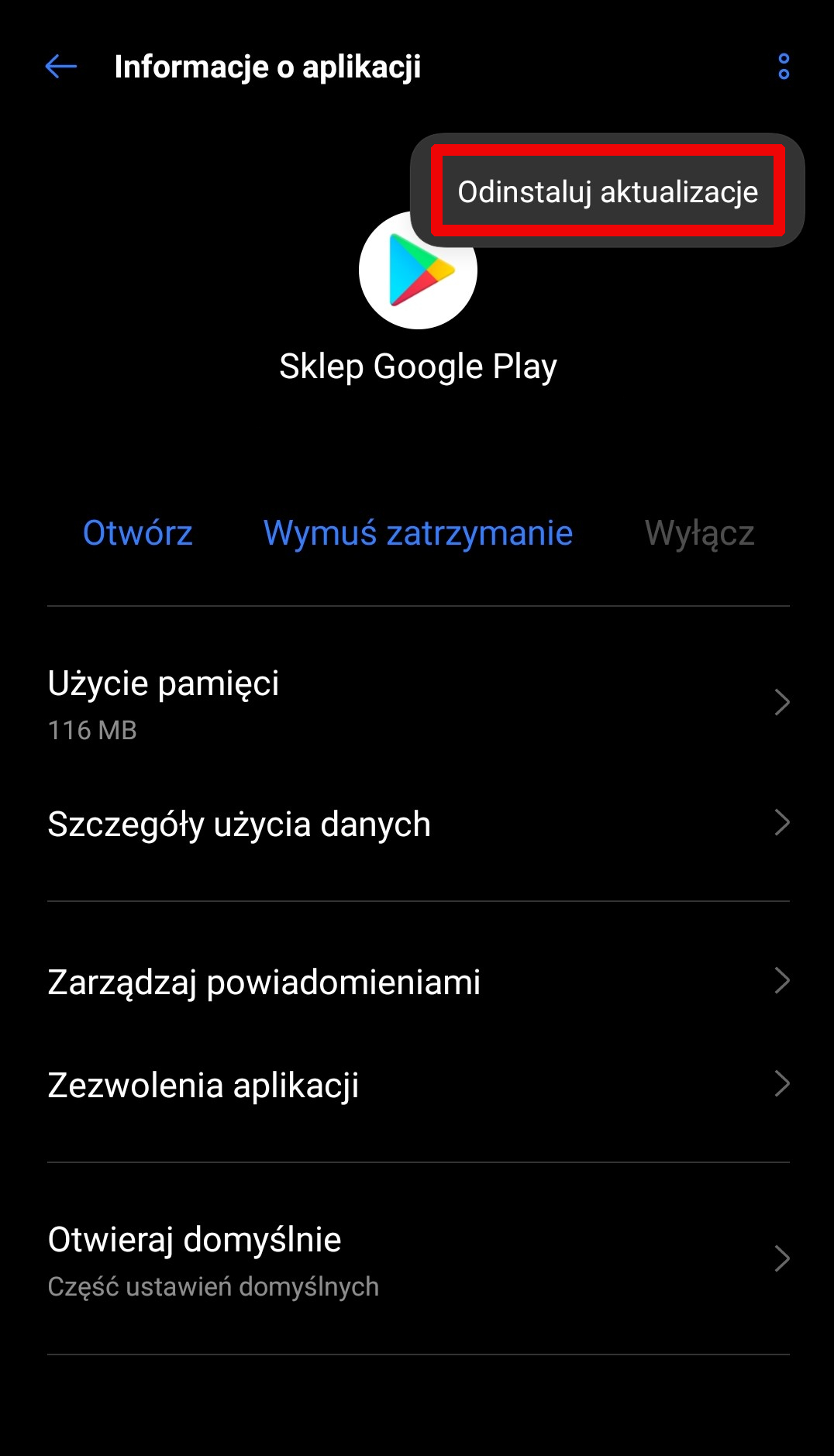 Sposób drugi – usunięcie aktualizacji sklepu Google Play