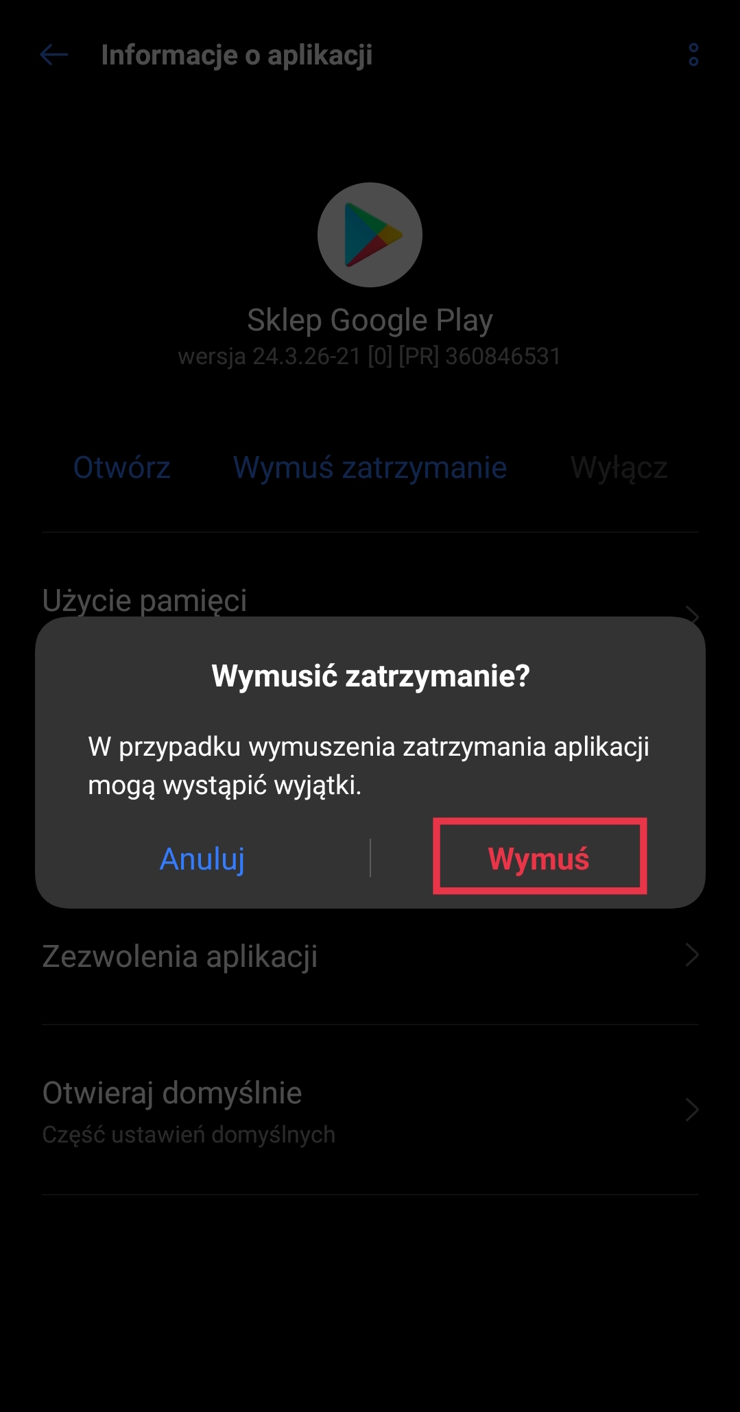 - W opcjach aplikacji wybierz w pierwszej kolejności opcję „Wymuś zatrzymanie” – ta opcja sprawi, że sklep przestanie działać w tle (zostanie usunięty z pamięci RAM). Po kliknięciu potwierdź, że chcesz zatrzymać aplikację.