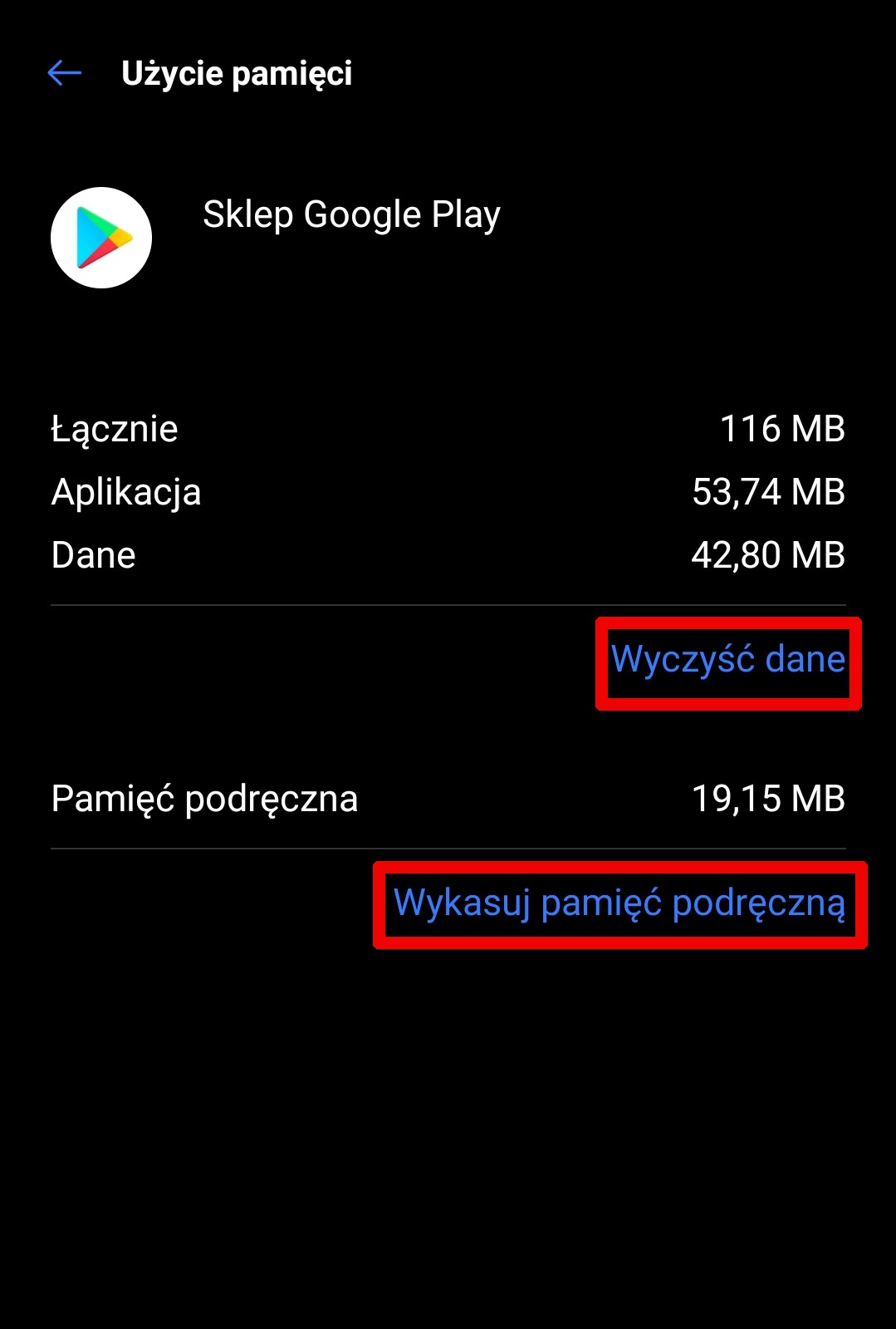 Usunięcie danych aplikacji i danych podręcznych Google Play