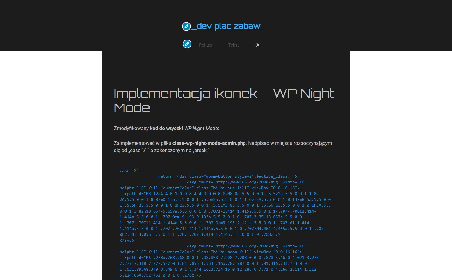 Jak widać powyżej, wtyczka nie oferuje zbyt wielu opcji personalizacji. Dlatego też resztę treści na stronie zmuszeni jesteśmy sami dopisać i nadać im odpowiednie kolory po włączeniu ciemnego trybu, ale to dopiero w pliku CSS strony (później).