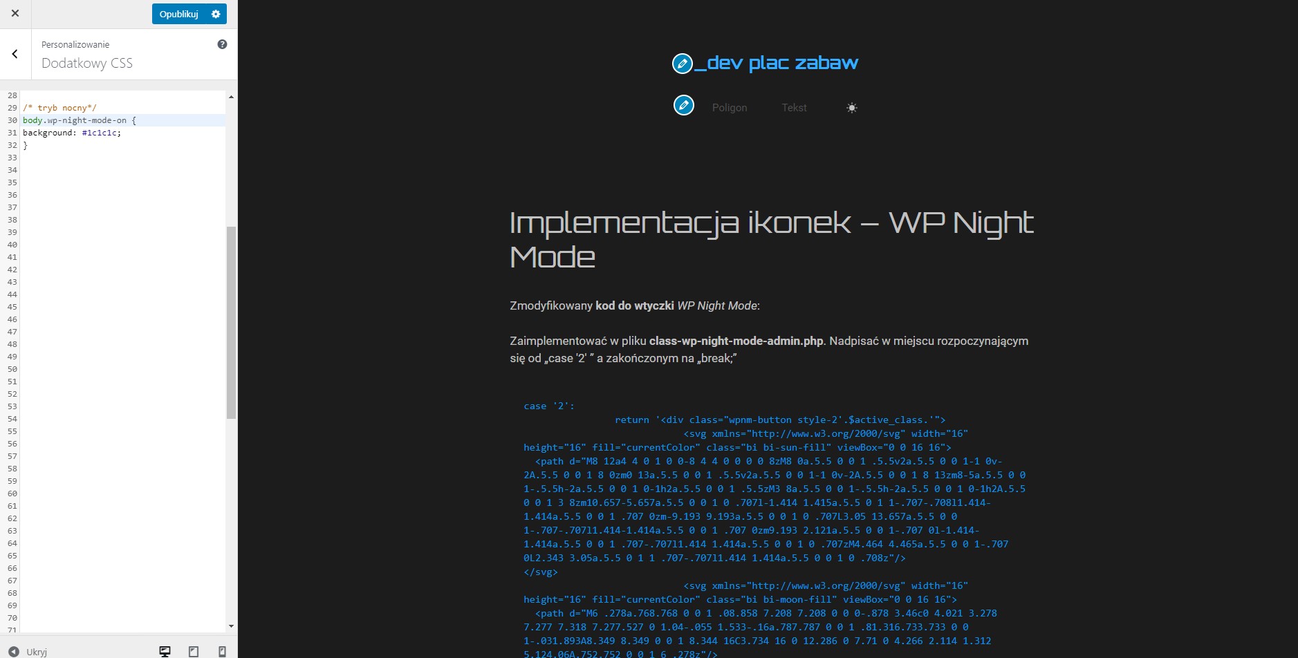 Teraz trzeba dopisać kod do dodatkowego CSS strony, aby ikonki zamieniały i działały jak przycisk ciemnego trybu.