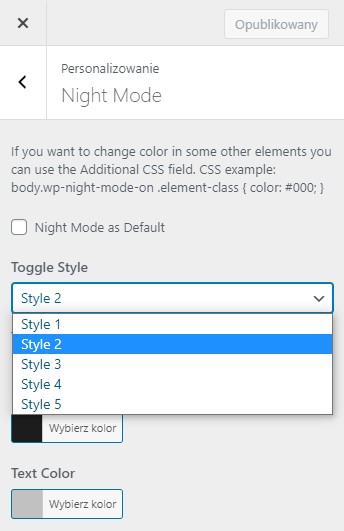 Otworzy Ci się okno ustawień kolorów trybu ciemnego. Możesz ustawić w nim: domyślnie włączony ciemny motyw (Night Mode as Default), wygląd przycisku (Toggle Style) oraz jego rozmiar (Toggle Size).