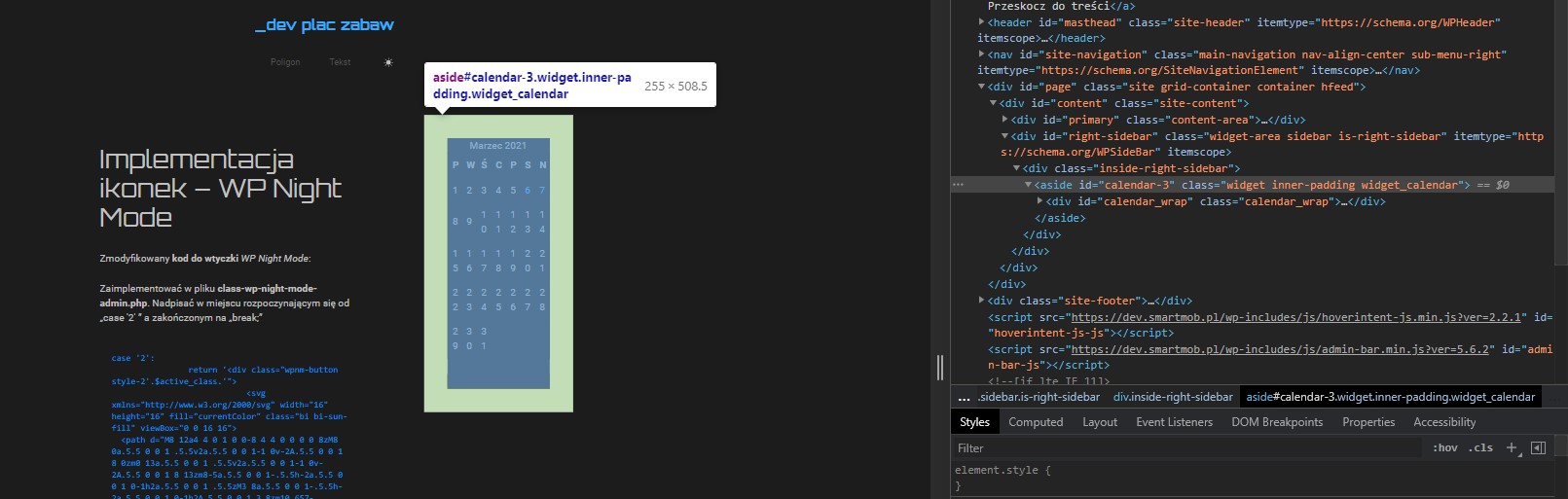 Otworzy się okno po prawej stronie lub u dołu przeglądarki. Okno to posłuży do badania klass i Id strony, które nie zmieniają domyślnie kolorów, gdy włączymy tryb nocny strony.