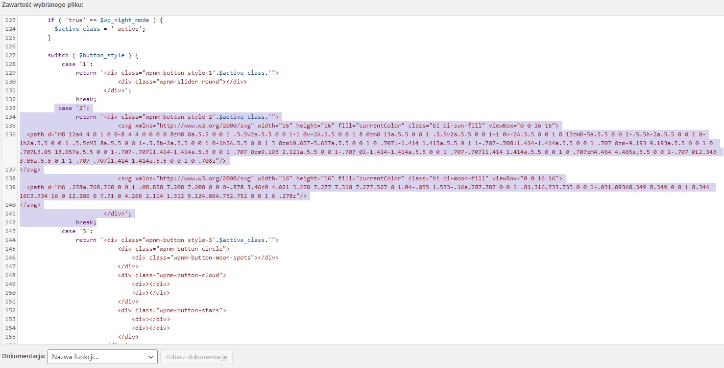 Aby dodać wybrane przyciski włączania trybu ciemnego strony, musimy edytować pliki wtyczki WP Night Mode. Nie będzie to trudne, jeśli mamy gotowy do wstawienia kod – już go przygotowałem.