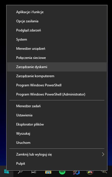 Aby zainicjować nowy dysk należy uruchomić narzędzie nazwane „zarządzanie dyskami”. Uruchomisz je, klikając prawym przyciskiem myszy na ikonę Windowsa w lewym dolnym rogu – spośród listy opcji wybierz „zarządzanie dyskami”.